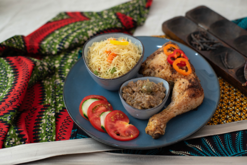 Le poulet vermicelle est un plat qui associe de poulet grillé avec des vermicelles (des pâtes très fines, souvent à base de farine de blé) et une sauce oignon assaisonnée d’épice (Thym, origan, herbes de provinces).